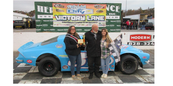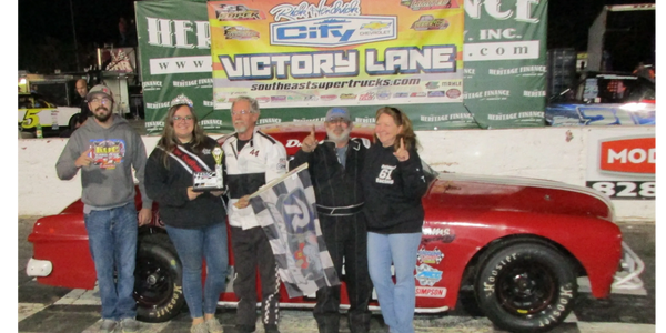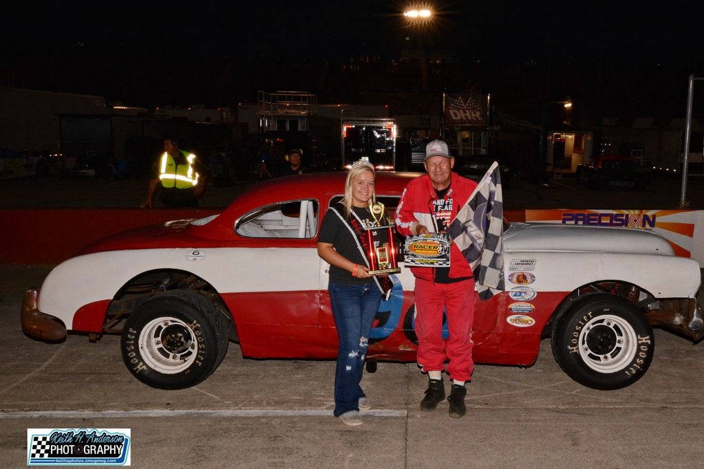 Don Fenn takes advantage of the slim field of Vintage Outlaw cars to meet his wife in Victory Lane as the overall 25 lap feature winner.