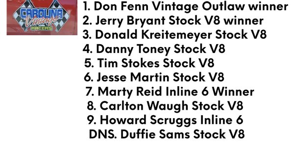Josh Roberts makes his 1st outing with the Carolina Vintage Racers count by taking the checkers in the 25 lapper. Later he got 3rd in the Outlaws race
